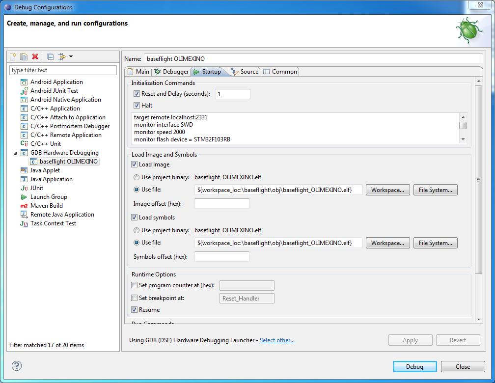 It's important to have build the executable compiled with GDB debugging information first. Select the appropriate .elf file (not hex file) - In these examples the target platform is an OLIMEXINO.